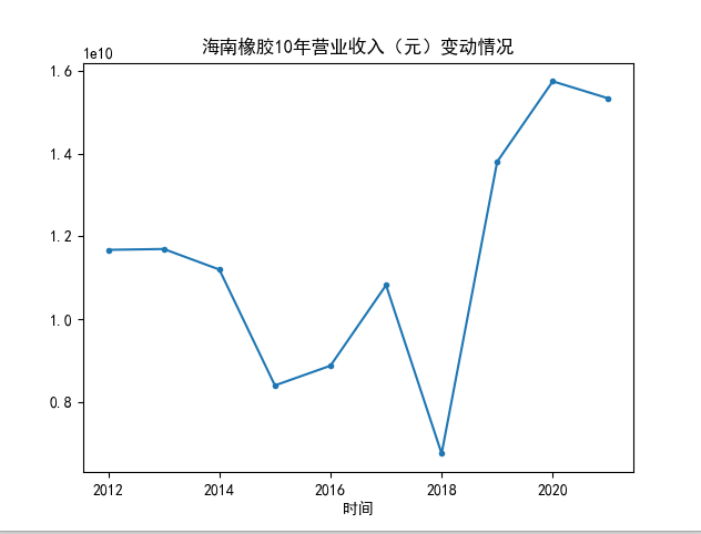 plt.title('{}近10年营业收入(元)变动情况'.format(company)) # 折线图标题