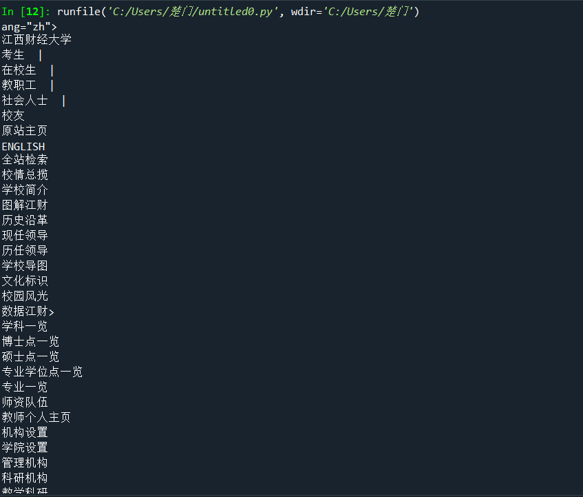 运用requests得到网页代码,获取江财官网源代码并写入text,再用BeautifulSoup获得text内容,导入re模块换行。