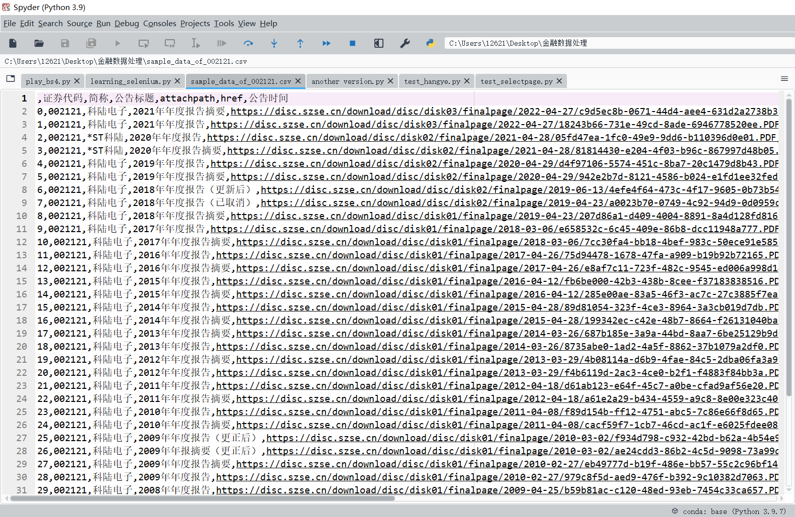 - 定义函数txt_to_df(),利用正则表达式对相应的标签对进行搜索,找出“证券代码”、“简称”、“公告标题”、“公告时间”的对应内容;