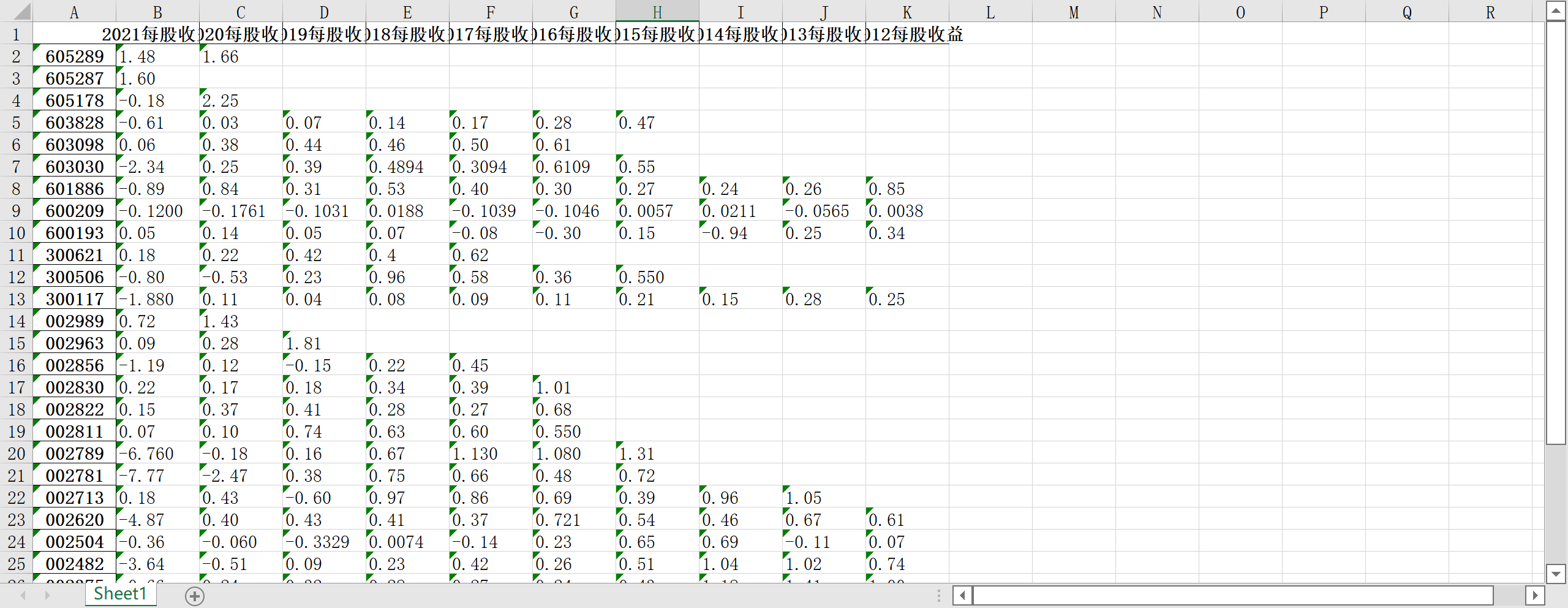 list_row_profit = csv_profit_new1.values.tolist()#以行为单位取成列表,每个列表是十年同一公司的每股收益